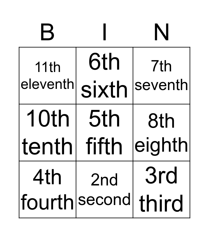 This bingo card has a free space and 11 words: 1st first, 2nd second, 3rd third, 4th fourth, 6th sixth, 7th seventh, 8th eighth, 9th ninth, 10th tenth, 11th eleventh and 12th twelfth.