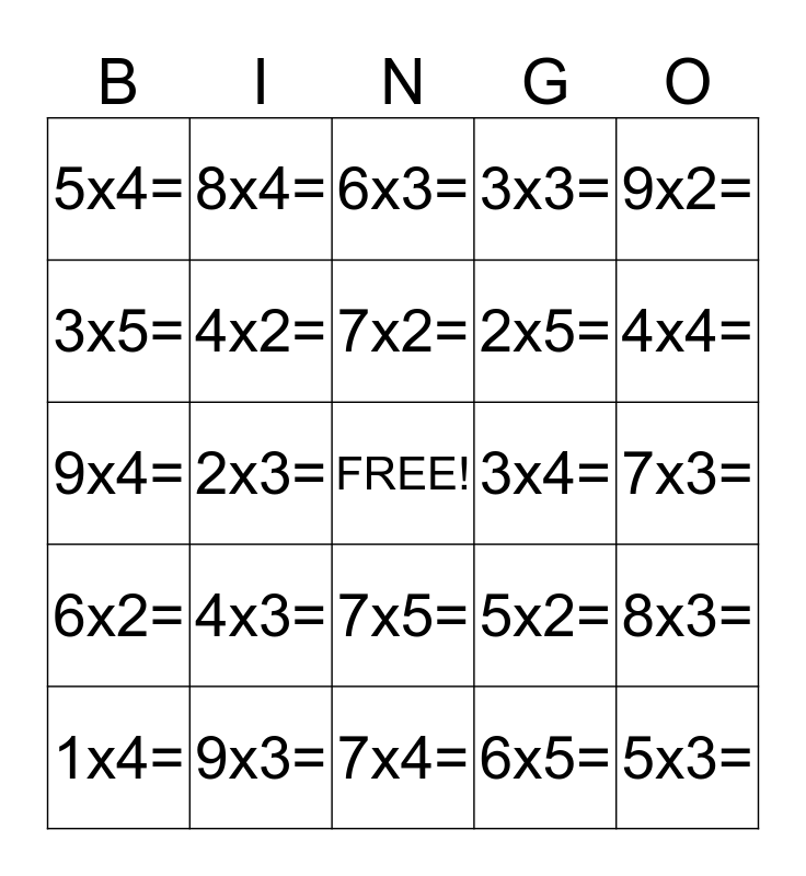 This bingo card has a free space and 36 words: 1x2=, 2x2=, 3x2=, 4x2=, 5x2=, 6x2=, 7x2=, 8x2=, 9x2=, 1x3=, 2x3=, 3x3=, 2x4=, 3x4=, 4x4=, 5x4=, 6x4=, 4x3=, 5x3=, 6x3=, 7x3=, 8x3=, 9x3=, 1x4=, 7x4=, 8x4=, 9x4=, 1x5=, 2x5=, 3x5=, 4x5=, 5x5=, 6x5=, 7x5=, 8x5= and 9x5=.