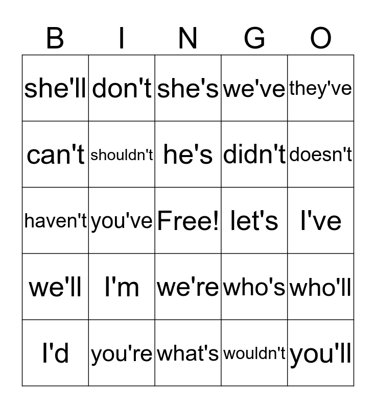 This bingo card has a free space and 24 words: I'm, you're, he's, I'd, they've, she'll, can't, don't, let's, we're, didn't, haven't, who's, who'll, shouldn't, wouldn't, I've, she's, doesn't, you've, you'll, we'll, we've and what's.