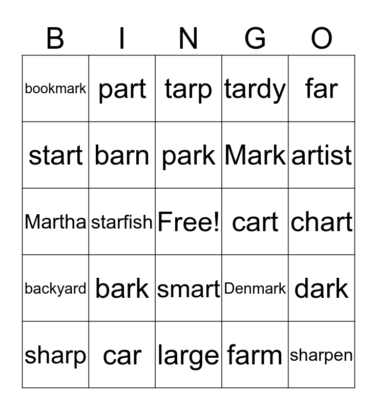 This bingo card has a free space and 24 words: bark, car, park, sharp, far, bookmark, start, part, cart, smart, Mark, Martha, Denmark, dark, barn, farm, chart, tarp, artist, starfish, sharpen, backyard, tardy and large.