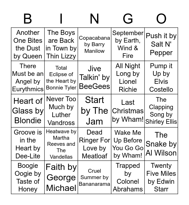 This bingo card has a free space and 24 words: Heatwave by Martha Reeves and The Vandellas, Faith by George Michael, Jive Talkin' by BeeGees, Boogie Oogie by Taste of Honey, Push it by Salt N' Pepper, Another One Bites the Dust by Queen, There Must be an Angel by Eurythmics, The Boys are Back in Town by Thin Lizzy, Last Christmas by Wham!, Dead Ringer For Love by Meatloaf, All Night Long by Lionel Richie, Heart of Glass by Blondie, Wake Me Up Before You Go Go by Wham!, The Snake by Al Wilson, Total Eclipse of the Heart by Bonnie Tyler, Trapped by Colonel Abrahams, The Clapping Song by Shirley Ellis, Copacabana by Barry Manilow, Pump it Up by Elvis Costello, Never Too Much by Luther Vandross, Twenty Five Miles by Edwin Starr, Groove is in the Heart by Dee-Lite, September by Earth, Wind & Fire and Cruel Summer by Bananarama.