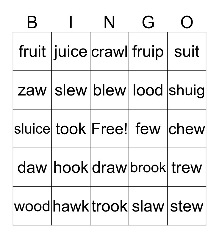 This bingo card has a free space and 24 words: hook, hawk, blew, wood, suit, fruit, zaw, juice, few, draw, lood, sluice, brook, trew, slew, slaw, chew, crawl, shuig, took, stew, daw, fruip and trook.