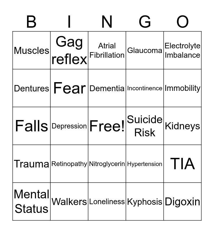 This bingo card has a free space and 76 words: Alzheimers, Anxiety, Atrial Fibrillation, Auditory Changes, Brain, Cancer, Canes, Cataracts, CHF, Circulation, Constipation, CVA-Stroke, Dementia, Dentures, Depends, Depression, Diabetes, Digoxin, Drug Toxicity, Electrolyte Imbalance, Eyeglasses, Falls, Fear, Gag reflex, Glaucoma, Hair Loss, Hearing, Hearing Aids, Heart Disease, Heartburn, Heminopsia, High I.O.S., Hip Fracture, Hypertension, Immobility, Incontinence, Infection, Joints, Kidneys, Kyphosis, Lasix, Liver, Macular Degeneration, Malnutrition, Medicare, Memory Loss, Mental Status, Muscles, Nails Thicken, Nerve Cells, Night Leg Cramps, Nitroglycerin, Nursing homes, Osteoporosis, Pacemakers, Pain, Pneumonia, Pulmonary Edema, Reflexes, Respiratory Muscles, Retinopathy, Salivation, Sight, Silent MI, Skin, Social Security, Suicide Risk, Taste, Teeth, Temp. Reg., TIA, Trauma, Walkers, COPD, Loneliness and Oxygen.