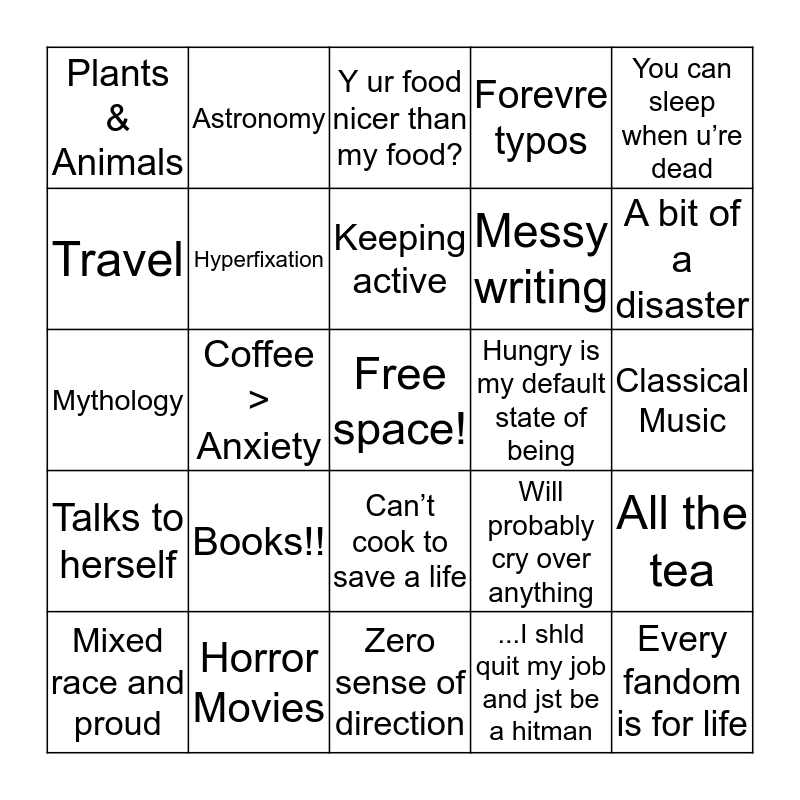 This bingo card has a free space and 24 words: Books!!, Horror Movies, Keeping active, Mixed race and proud, You can sleep when u’re dead, Plants & Animals, Travel, Astronomy, Hungry is my default state of being, Can’t cook to save a life, Messy writing, Mythology, Will probably cry over anything, All the tea, Hyperfixation, ...I shld quit my job and jst be a hitman, Classical Music, Y ur food nicer than my food?, A bit of a disaster, Coffee > Anxiety, Every fandom is for life, Talks to herself, Forevre typos and Zero sense of direction.