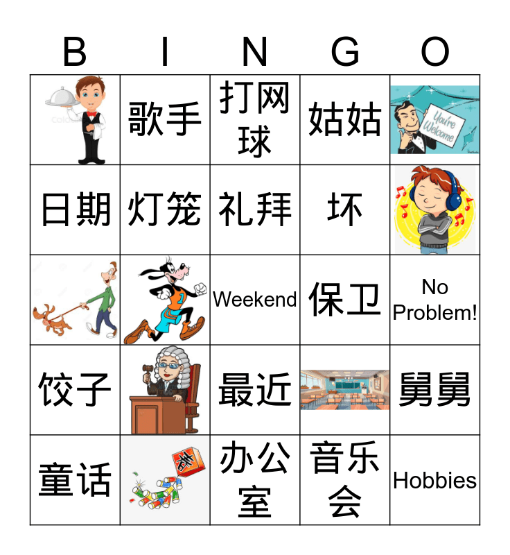 This bingo card has 8 images, a free space and 16 words: 童话, 礼拜, 音乐会, 歌手, 打网球, 保卫, No Problem!, 灯笼, 舅舅, 日期, 办公室, 姑姑, 饺子, 最近, 坏 and Hobbies.