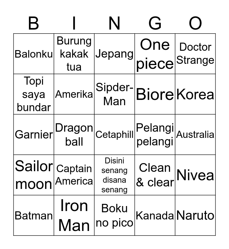 This bingo card has a free space and 24 words: Captain America, Iron Man, Sipder-Man, Batman, Doctor Strange, Balonku, Topi saya bundar, Burung kakak tua, Pelangi pelangi, Disini senang disana senang, Biore, Garnier, Clean & clear, Nivea, Amerika, Kanada, Australia, Jepang, Korea, Dragon ball, Naruto, Sailor moon, One piece and Boku no pico.