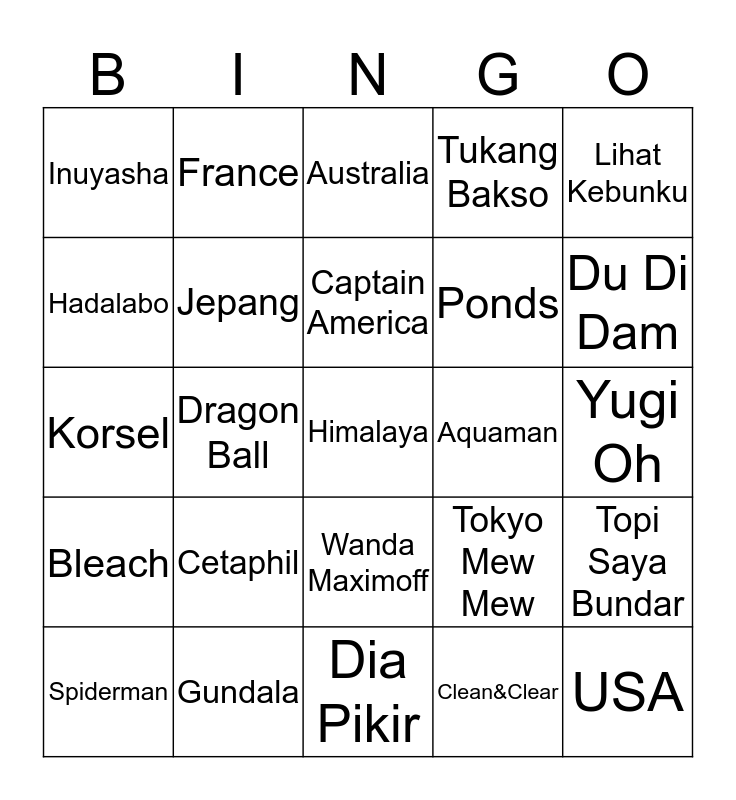 This bingo card has a free space and 24 words: Cetaphil, Gundala, Captain America, Spiderman, Lihat Kebunku, Inuyasha, Hadalabo, France, Aquaman, Wanda Maximoff, Ponds, Korsel, Tokyo Mew Mew, Topi Saya Bundar, Jepang, Clean&Clear, Yugi Oh, Australia, Du Di Dam, Dragon Ball, USA, Bleach, Tukang Bakso and Dia Pikir.