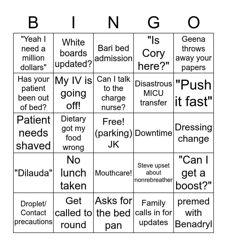 This bingo card has a free space and 24 words: No lunch taken, Get called to round, Can I talk to the charge nurse?, Droplet/ Contact precautions, Geena throws away your papers, "Yeah I need a million dollars", Has your patient been out of bed?, White boards updated?, Downtime, Mouthcare!, Disastrous MICU transfer, Patient needs shaved, Steve upset about nonrebreather, "Can I get a boost?", My IV is going off!, Family calls in for updates, Dressing change, Bari bed admission, "Push it fast", Dietary got my food wrong, premed with Benadryl, "Dilauda", "Is Cory here?" and Asks for the bed pan.