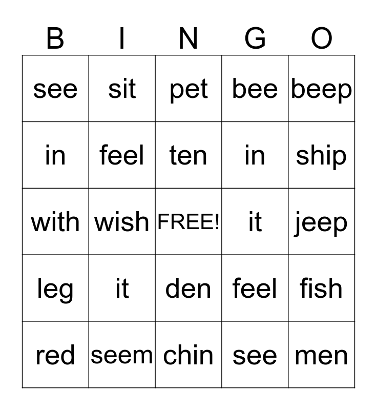 This bingo card has a free space and 24 words: it, seem, ten, red, beep, see, in, sit, it, den, in, with, feel, fish, feel, see, jeep, pet, ship, wish, men, leg, bee and chin.