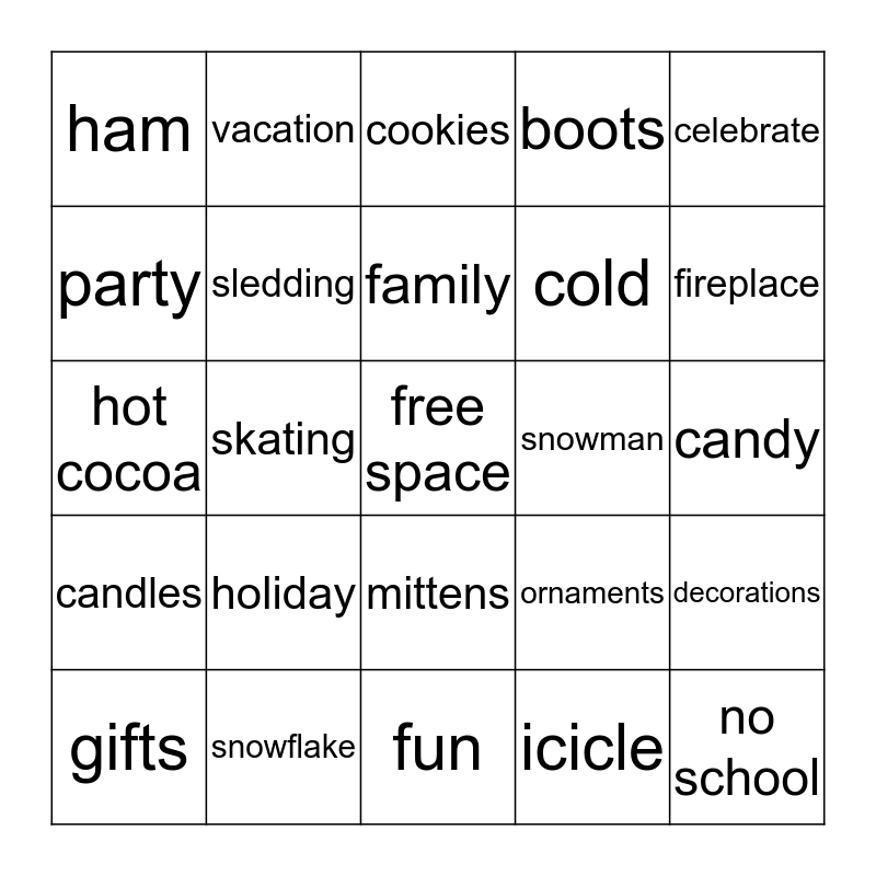 This bingo card has a free space and 24 words: holiday, snowflake, family, gifts, celebrate, ham, party, vacation, snowman, mittens, cold, hot cocoa, ornaments, decorations, sledding, icicle, candy, cookies, fireplace, skating, no school, candles, boots and fun.