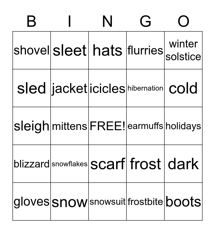 This bingo card has a free space and 24 words: snowflakes, snow, icicles, gloves, winter solstice, shovel, sled, sleet, earmuffs, scarf, hibernation, sleigh, frost, dark, jacket, frostbite, holidays, hats, cold, mittens, boots, blizzard, flurries and snowsuit.
