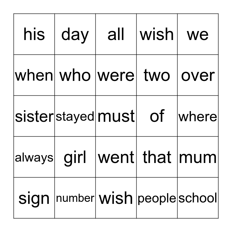 This bingo card has 41 words: boy, girl, gave, two, school, always, stayed, should, wish, where, when, who, were, people, over, sister, brother, all, sigh, we, sign, he, went, of, undo, then, number, baby, that, or, words, day, must, worry, mum, his, go, wish, home, are and duck.