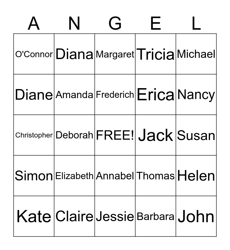 This bingo card has a free space and 42 words: Roger, Frederich, Jane, Elizabeth, Barbara, Helen, John, Bartlett, Margaret, Annabel, Susan, Nancy, Deborah, Michael, Douglas, Thomas, Peter, Christopher, Katherine, Diana, Diane, Ethel, Duncan, O'Connor, Hannah, Zoe, Erica, Joanne, Sandra, Maureen, Joan, Simon, Amanda, Jessie, Olivia, Kate, Claire, Jack, Marina, Lewis, Tricia and Emilie.