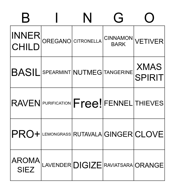 This bingo card has a free space and 51 words: LEMON, ORANGE, BERGAMONT, DIGIZE, LEMONGRASS, SCLARESSENCE, OREGANO, ROSEMARY, BASIL, PEPPERMINT, SPEARMINT, CINNAMON BARK, CLOVE, GINGER, PEACE & CALMING, COPAIBA, NUTMEG, FENNEL, GENTLE BABY, VETIVER, PURIFICATION, RAVIATSARA, INNER CHILD, TANGERINE, NL BLACK SPRUCE, PALO SANTO, XMAS SPIRIT, WINTERGREEN, AROMA SIEZ, CITRONELLA, FRANKINCENSE, ABUNDANCE, PINE, BLUE CYPRESS, SARA, LAVENDER, WHITE ANGELICA, RED SHOT, CEDER WOOD, PANAWAY, THIEVES, PRO+, TEA TREE, LIME, JOY, STRESS AWAY, RAVEN, PANAWAY, CITRUS FRESH, RUTAVALA and DEEP RELIEF.