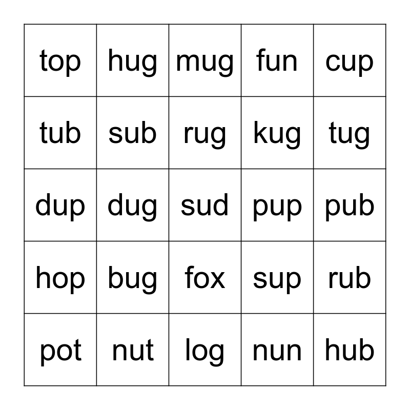 This bingo card has 25 words: bug, log, rug, pot, cup, top, tub, hug, pup, fox, kug, dup, sup, rub, sub, hub, pub, mug, tug, dug, sud, nut, hop, fun and nun.