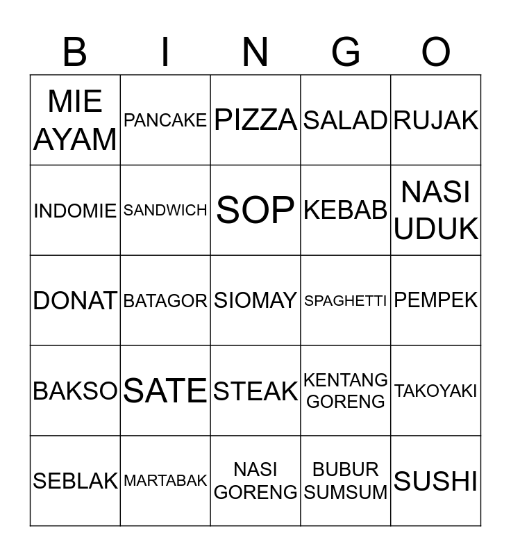 This bingo card has 25 words: SATE, NASI GORENG, SOP, SEBLAK, RUJAK, MIE AYAM, INDOMIE, PANCAKE, SPAGHETTI, STEAK, KEBAB, DONAT, KENTANG GORENG, TAKOYAKI, SANDWICH, SUSHI, PEMPEK, PIZZA, NASI UDUK, BATAGOR, SIOMAY, MARTABAK, BAKSO, SALAD and BUBUR SUMSUM.