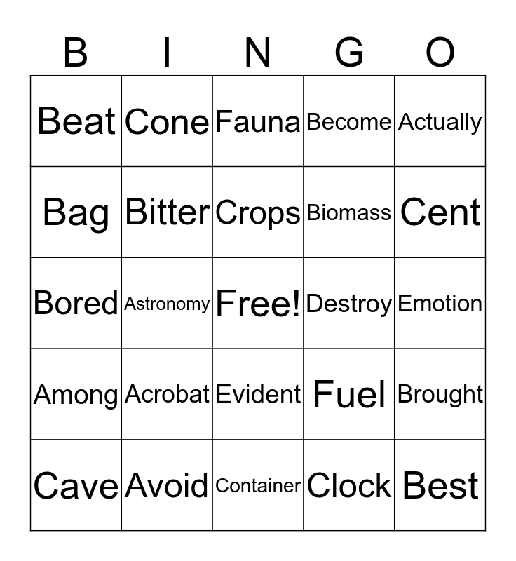 This bingo card has a free space and 24 words: Acrobat, Avoid, Crops, Cave, Actually, Beat, Bag, Cone, Destroy, Evident, Biomass, Bored, Fuel, Brought, Bitter, Clock, Emotion, Fauna, Cent, Astronomy, Best, Among, Become and Container.