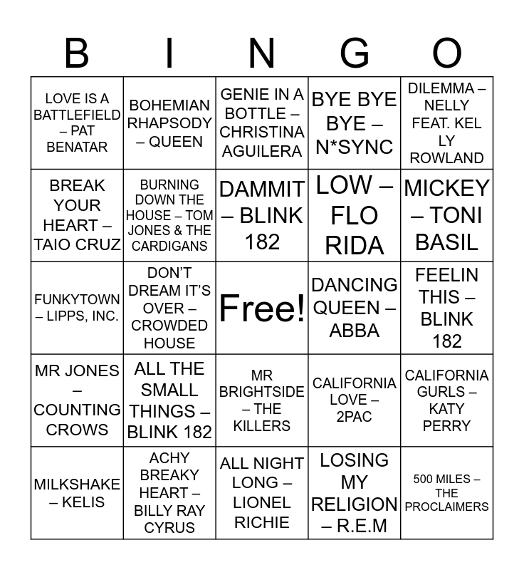 This bingo card has a free space and 49 words: …BABY ONE MORE TIME – BRITNEY SPEARS, 500 MILES – THE PROCLAIMERS, 99 PROBLEMS/ONE STEP CLOSER – JAY Z & LINKIN PARK, ALL NIGHT LONG – LIONEL RICHIE, ALL THE SMALL THINGS – BLINK 182, BLUE – EIFFEL 65, BOHEMIAN RHAPSODY – QUEEN, BORN IN THE USA – BRUCE SPRINGSTEEN, BREAK YOUR HEART – TAIO CRUZ, BROWN EYED GIRL – VAN MORRISON, BURNING DOWN THE HOUSE – TOM JONES & THE CARDIGANS, BYE BYE BYE – N*SYNC, CALIFORNIA GURLS – KATY PERRY, CALIFORNIA LOVE – 2PAC, COME TOGETHER – THE BEATLES, CRAZY – GNARLS BARKLEY, DAMMIT – BLINK 182, DANCING QUEEN – ABBA, DAY N NIGHT – KID CUDDI, DILEMMA – NELLY FEAT. KELLY ROWLAND, DON’T DREAM IT’S OVER – CROWDED HOUSE, LOSING MY RELIGION – R.E.M, LOVE IS A BATTLEFIELD – PAT BENATAR, LOW – FLO RIDA, MAN! I FEEL LIKE A WOMAN – SHANIA TWAIN, MICKEY – TONI BASIL, MILKSHAKE – KELIS, MMMBOP – HANSON, MR BRIGHTSIDE – THE KILLERS, MR JONES – COUNTING CROWS, MS JACKSON – OUTKAST, MY HEART WILL GO ON – CELINDON’T STOP BELIEVIN – JOURNEY, FEEL GOOD INC – THE GORILLAZ, ABC – JACKSON 5, ACHY BREAKY HEART – BILLY RAY CYRUS, AFRICA – TOTO, AINT NO MOUNTAIN HIGH ENOUGH – MARVIN GAYE & TAMMI TERRELL, ALL MY FRIENDS – SNAKEHIPS FEAT TINASHE, FEELIN THIS – BLINK 182, FIGHT FOR YOUR RIGHT – BEASTIE BOYS, FIRESTARTER – THE PRODIGY, FLAME TREES – COLD CHISEL, FOLLOW ME – UNCLE KRACKER, FRIDAY I’M IN LOVE – THE CURE, FUNKYTOWN – LIPPS, INC., GENIE IN A BOTTLE – CHRISTINA AGUILERA, GET BUSY – SEAN PAUL, GET LOW – LIL JON & THE EATSIDE BOYZ and GET THE PARTY STARTED – P!NK.