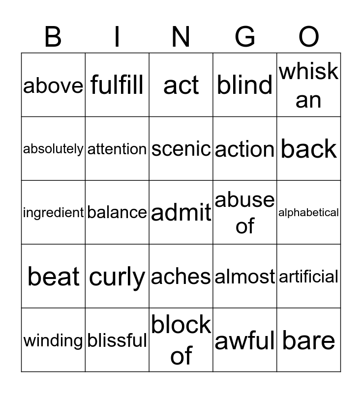 This bingo card has a free space and 24 words: curly, blissful, scenic, winding, whisk an, above, absolutely, fulfill, abuse of, aches, action, ingredient, almost, artificial, attention, awful, alphabetical, act, back, balance, bare, beat, blind and block of.