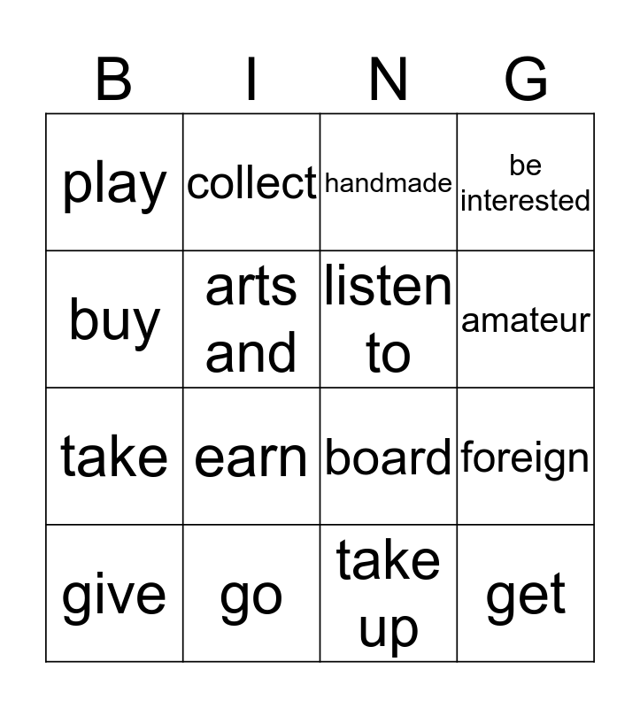 This bingo card has 16 words: go, foreign, handmade, play, take, collect, board, take up, buy, arts and, give, be interested, earn, amateur, listen to and get.