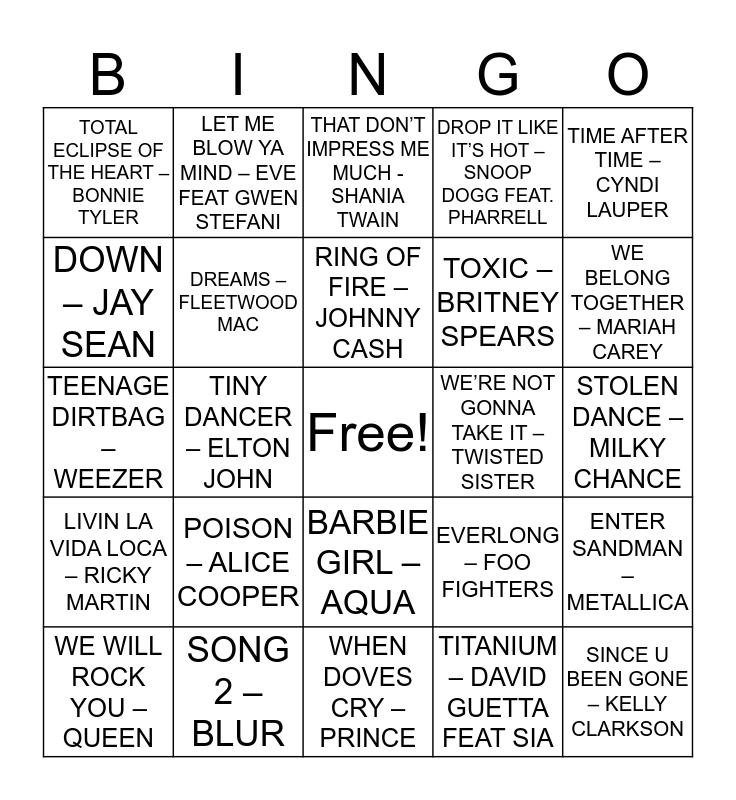 This bingo card has a free space and 49 words: SHOUT – TEARS FOR FEARS, SINCE U BEEN GONE – KELLY CLARKSON, SINGLE LADIES – BEYONCE, WHEN DOVES CRY – PRINCE, POISON – ALICE COOPER, KILLING IN THE NAME – RAGE AGAINST THE MACHINE, LET ME BLOW YA MIND – EVE FEAT GWEN STEFANI, I’M A BELIEVER – THE MONKEES, DOWN – JAY SEAN, DOWN UNDER – MEN AT WORK, DREAMS – FLEETWOOD MAC, DROP IT LIKE IT’S HOT – SNOOP DOGG FEAT. PHARRELL, ENTER SANDMAN – METALLICA, EVERLONG – FOO FIGHTERS, RESPECT – ARETHA FRANKLIN, RIDIN SOLO – JASON DERULO, RING OF FIRE – JOHNNY CASH, WE’RE NOT GONNA TAKE IT – TWISTED SISTER, WHAT’S LOVE GOT TO DO WITH IT – TINA TURNER, TIME AFTER TIME – CYNDI LAUPER, TINY DANCER – ELTON JOHN, TITANIUM – DAVID GUETTA FEAT SIA, TOTAL ECLIPSE OF THE HEART – BONNIE TYLER, TOXIC – BRITNEY SPEARS, WE ARE FAMILY – SISTER SLEDGE, WE BELONG TOGETHER – MARIAH CAREY, WE WILL ROCK YOU – QUEEN, BABY SHARK – PINKFONG, BARBIE GIRL – AQUA, LIVIN LA VIDA LOCA – RICKY MARTIN, LIVIN ON A PRAYER – BON JOVI, LONDON BRIDGE - FERGIE, SK8ER BOI – AVRIL LAVIGNE, SOMEBODY THAT I USE TO KNOW – GOTYE, SONG 2 – BLUR, SPICE UP YOUR LIFE – SPICE GIRLS, STACY’S MOM – FOUNTAINS OF WAYNE, STAYING ALIVE – BEE GEES, STOLEN DANCE – MILKY CHANCE, SUGAR, WE’RE GOING DOWN – FALL OUT BOY, SUPER FREAK – RICK JAMES, SUPERSTITION – STEVIE WONDER, SWEET CAROLINE – NEIL DIAMOND, TAKE ON ME – A-HA, TEENAGE DIRTBAG – WEEZER, THAT DON’T IMPRESS ME MUCH - SHANIA TWAIN, THANK YOU, NEXT – ARIANA GRANDE, FOUND YOU – BENNY BLANCO, CALVIN HARRIS and MANS NOT HOT – BIG SHAQ.