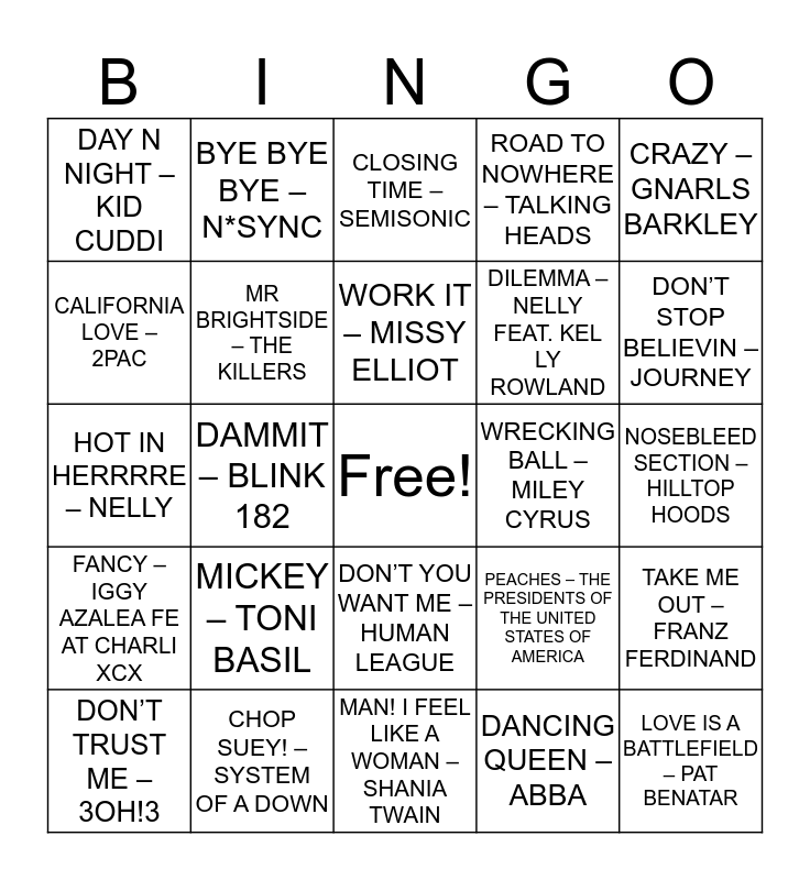 This bingo card has a free space and 49 words: LOSING MY RELIGION – R.E.M, LOVE IS A BATTLEFIELD – PAT BENATAR, LOW – FLO RIDA, MAN! I FEEL LIKE A WOMAN – SHANIA TWAIN, MICKEY – TONI BASIL, THIS IS HOW WE DO IT – MONTELL JORDAN, BYE BYE BYE – N*SYNC, CALIFORNIA GURLS – KATY PERRY, CALIFORNIA LOVE – 2PAC, COME TOGETHER – THE BEATLES, MR BRIGHTSIDE – THE KILLERS, ROAD TO NOWHERE – TALKING HEADS, TAKE ME OUT – FRANZ FERDINAND, PEACHES – THE PRESIDENTS OF THE UNITED STATES OF AMERICA, OCEAN – MARTIN GARRIX FEAT KHALID, PLAY THAT FUNKY MUSIC – WILD CHERRY, WORK IT – MISSY ELLIOT, WRECKING BALL – MILEY CYRUS, MY SHARONA – THE KNACK, CRAZY – GNARLS BARKLEY, DAMMIT – BLINK 182, DANCING QUEEN – ABBA, DAY N NIGHT – KID CUDDI, DILEMMA – NELLY FEAT. KELLY ROWLAND, DON’T DREAM IT’S OVER – CROWDED HOUSE, DON’T STOP BELIEVIN – JOURNEY, DON’T TRUST ME – 3OH!3, DON’T WORRY, BE HAPPY – BOBBY MCFERRIN, DON’T YOU WANT ME – HUMAN LEAGUE, FANCY – IGGY AZALEA FEAT CHARLI XCX, FEEL GOOD INC – THE GORILLAZ, ABC – JACKSON 5, ACHY BREAKY HEART – BILLY RAY CYRUS, CAN’T GET YOU OUT OF MY HEAD – KYLIE MINOGUE, CHOP SUEY! – SYSTEM OF A DOWN, NEVER GONNA GIVE YOU UP – RICK ASTLEY, NO DIGGITY – BLACKSTREET, NO SCRUBS – TLC, NOSEBLEED SECTION – HILLTOP HOODS, NOTHING BREAKS LIKE A HEART – MARK RONSON FEAT. MILEY CYRUS, POKER FACE – LADY GAGA, PRETTY FLY – THE OFFSPRING, PUSH IT – SALT-N-PEPPER, REHAB – AMY WINEHOUSE, HOT IN HERRRRE – NELLY, CLOSING TIME – SEMISONIC, COCO JAMBOO – MR PRESIDENT, AFRICA – TOTO and AINT NO MOUNTAIN HIGH ENOUGH – MARVIN GAYE & TAMMI TERRELL.