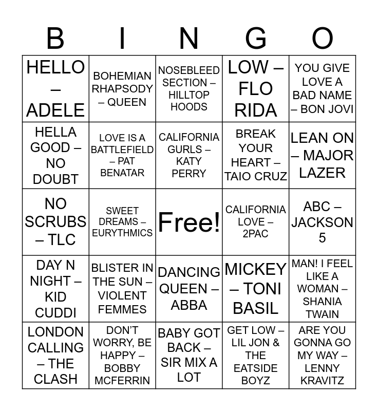 This bingo card has a free space and 49 words: GET THE PARTY STARTED – P!NK, ARE YOU GONNA GO MY WAY – LENNY KRAVITZ, BABY – JUSTIN BIEBER, BABY GOT BACK – SIR MIX A LOT, BLISTER IN THE SUN – VIOLENT FEMMES, BLUE – EIFFEL 65, BOHEMIAN RHAPSODY – QUEEN, BORN IN THE USA – BRUCE SPRINGSTEEN, HELLA GOOD – NO DOUBT, LOSING MY RELIGION – R.E.M, LOVE IS A BATTLEFIELD – PAT BENATAR, LOW – FLO RIDA, MAN! I FEEL LIKE A WOMAN – SHANIA TWAIN, MICKEY – TONI BASIL, THIS IS HOW WE DO IT – MONTELL JORDAN, BYE BYE BYE – N*SYNC, CALIFORNIA GURLS – KATY PERRY, CALIFORNIA LOVE – 2PAC, COME TOGETHER – THE BEATLES, YOU GIVE LOVE A BAD NAME – BON JOVI, SWEET DREAMS – EURYTHMICS, GET LOW – LIL JON & THE EATSIDE BOYZ, HELLO – ADELE, BREAK YOUR HEART – TAIO CRUZ, BROWN EYED GIRL – VAN MORRISON, LEAN ON – MAJOR LAZER, LONDON CALLING – THE CLASH, LOSE YOURSELF – EMINEM, DANCING QUEEN – ABBA, DAY N NIGHT – KID CUDDI, DILEMMA – NELLY FEAT. KELLY ROWLAND, DON’T DREAM IT’S OVER – CROWDED HOUSE, DON’T STOP BELIEVIN – JOURNEY, DON’T TRUST ME – 3OH!3, DON’T WORRY, BE HAPPY – BOBBY MCFERRIN, DON’T YOU WANT ME – HUMAN LEAGUE, FANCY – IGGY AZALEA FEAT CHARLI XCX, FEEL GOOD INC – THE GORILLAZ, ABC – JACKSON 5, ACHY BREAKY HEART – BILLY RAY CYRUS, CAN’T GET YOU OUT OF MY HEAD – KYLIE MINOGUE, CHOP SUEY! – SYSTEM OF A DOWN, NEVER GONNA GIVE YOU UP – RICK ASTLEY, NO DIGGITY – BLACKSTREET, NO SCRUBS – TLC, NOSEBLEED SECTION – HILLTOP HOODS, NOTHING BREAKS LIKE A HEART – MARK RONSON FEAT. MILEY CYRUS, POKER FACE – LADY GAGA and PRETTY FLY – THE OFFSPRING.