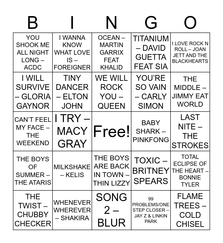 This bingo card has a free space and 49 words: FIRESTARTER – THE PRODIGY, FLAME TREES – COLD CHISEL, SOMEBODY THAT I USE TO KNOW – GOTYE, SONG 2 – BLUR, MILKSHAKE – KELIS, FAITH – GEORGE MICHAELI WANNA DANCE WITH SOMEBODY – WHITNEY HOUSTON, I WANNA KNOW WHAT LOVE IS – FOREIGNER, I WANT IT THAT WAY – BACKSTREET BOYS, I WILL SURVIVE – GLORIA GAYNOR, I’LL BE THERE FOR YOU – THE REMBRANDTS, TINY DANCER – ELTON JOHN, TITANIUM – DAVID GUETTA FEAT SIA, TOTAL ECLIPSE OF THE HEART – BONNIE TYLER, TOXIC – BRITNEY SPEARS, WE ARE FAMILY – SISTER SLEDGE, WE BELONG TOGETHER – MARIAH CAREY, WE WILL ROCK YOU – QUEEN, BABY SHARK – PINKFONG, I KISSED A GIRL – KATY PERRY, I LOVE ROCK N ROLL – JOAN JETT AND THE BLACKHEARTS, I TRY – MACY GRAY, 99 PROBLEMS/ONE STEP CLOSER – JAY Z & LINKIN PARK, YOU SHOOK ME ALL NIGHT LONG – ACDC, YOU’RE SO VAIN – CARLY SIMON, ZOMBIE – THE CRANBERRIES, THE MIDDLE – JIMMY EAT WORLD, THE TWIST – CHUBBY CHECKER, SWEET CHILD O’MINE – GUNS N ROSES, THE BOYS ARE BACK IN TOWN – THIN LIZZY, THE BOYS OF SUMMER – THE ATARIS, WHERE IS THE LOVE – BLACK EYED PEAS, WHIP IT – DEVO, WILD WORLD – CAT STEVENS, WONDERWALL – OASIS, WHENEVER WHEREVER – SHAKIRA, KING KUNTA – KENDRICK LAMAR, KISS FROM A ROSE – SEAL, LAST KISS – PEARL JAM, LAST NITE – THE STROKES, BEAT IT – MICHAEL JACKSON, HEY, SOUL SISTER – TRAIN, HOLLABACK GIRL – GWEN STEFANI, HOOK ME UP – THE VERONICAS, CALL ME MAYBE – CARLY RAE JEPSEN, CAN’T FEEL MY FACE – THE WEEKEND, OCEAN – MARTIN GARRIX FEAT KHALID, PLAY THAT FUNKY MUSIC – WILD CHERRY, WORK IT – MISSY ELLIOT and WRECKING BALL – MILEY CYRUS.