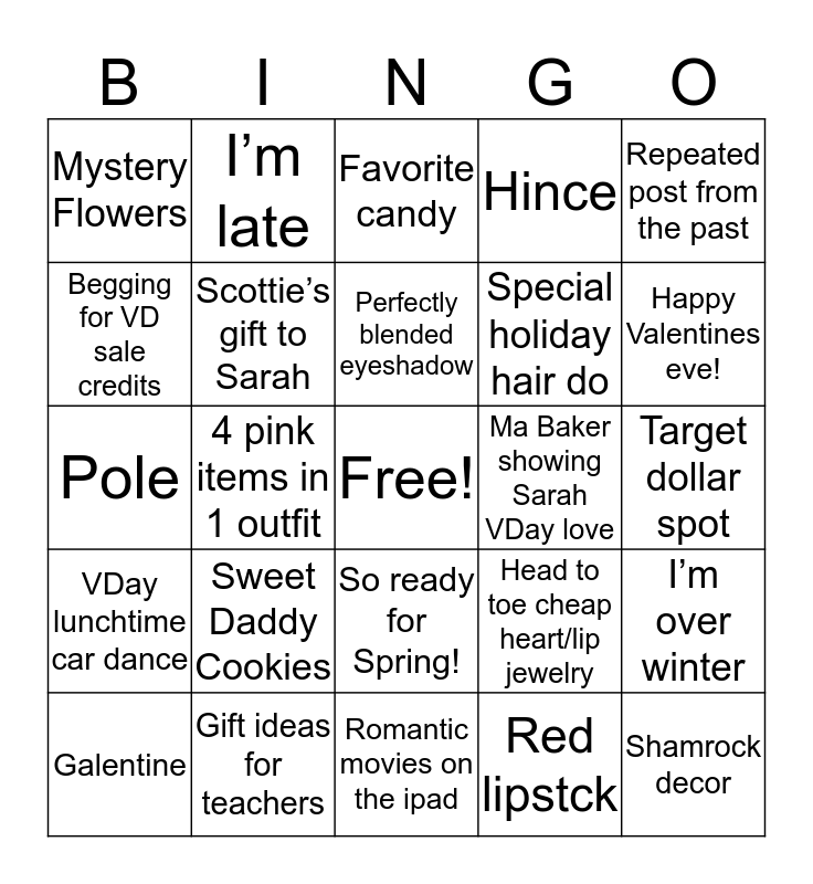 This bingo card has a free space and 29 words: Galentine, Lip sweater, 4 pink items in 1 outfit, 4 red items in 1 outfit, Mystery Flowers, Favorite candy, Scottie’s gift to Sarah, Sweet Daddy Cookies, Ma Baker showing Sarah VDay love, Gift ideas for teachers, Target dollar spot, Shamrock decor, Romantic movies on the ipad, Red lipstck, Happy Valentines eve!, The decorated table, So ready for Spring!, VDay lunchtime car dance, Repeated post from the past, Pole, Head to toe cheap heart/lip jewelry, Close up of valentines meal, Special holiday hair do, Begging for VD sale credits, Hince, I’m late, I’m over winter, Perfectly blended eyeshadow and Double nose.