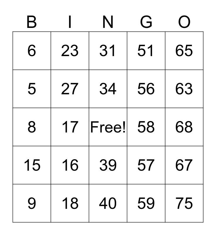 This bingo card has a free space and 75 words: 1, 30, 31, 60, 61, 2, 29, 31, 59, 62, 3, 28, 58, 63, 4, 27, 33, 57, 64, 5, 26, 34, 56, 65, 6, 25, 35, 55, 66, 7, 24, 36, 54, 67, 8, 23, 37, 53, 68, 9, 22, 38, 52, 69, 10, 21, 39, 51, 70, 11, 20, 40, 50, 71, 12, 19, 41, 49, 72, 13, 18, 42, 48, 73, 14, 17, 43, 47, 74, 15, 16, 44, 46, 75 and 45.