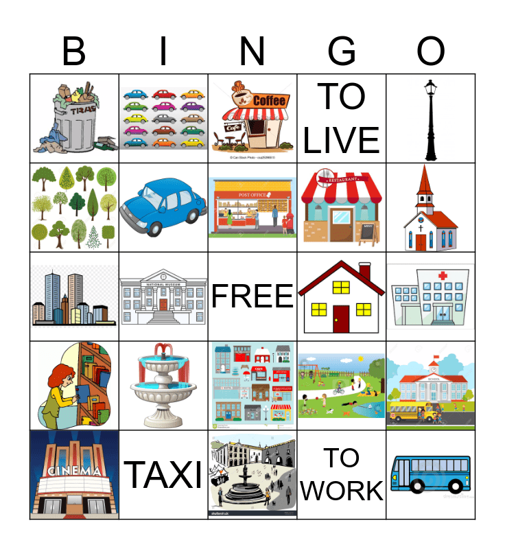 This bingo card has 22 images, a free space and 3 words: TAXI, TO LIVE and TO WORK.