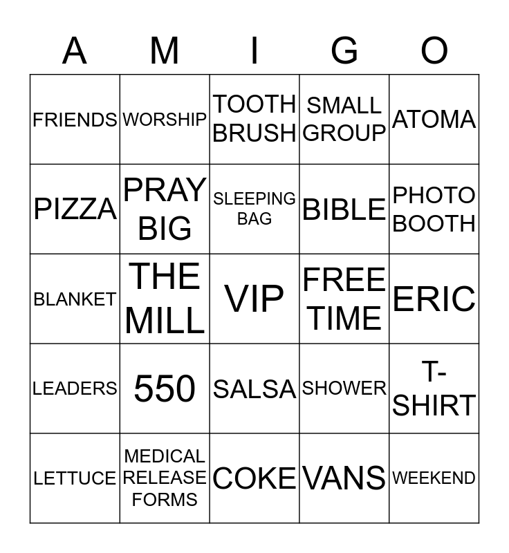 This bingo card has 49 words: NO PHONES, VIP, NOLAN, COKE, 550, DARIA, WORSHIP, TBF, PIZZA, JESUS, PRAY BIG, SMALL GROUP, T-SHIRT, SHOWER, CHIPS, HOST HOMES, SLEEPING BAG, FREE TIME, CEREAL, ATOMA, THE MILL, VANS, FRIENDS, BIBLE, PARENT MEETING, PHOTO BOOTH, LETTUCE, CANDY, SALSA, LEADERS, LUGGAGE, JOSH, SUGAR, NO SLEEP, MEDICAL RELEASE FORMS, $65, WATER TOWN, LEBANON, ERIC, UN DIVIDED, JOURNAL, FUN, WEEKEND, PILLOW, BLANKET, TOOTH BRUSH, TOOTH PASTE, TOWEL and SHAMPOO.