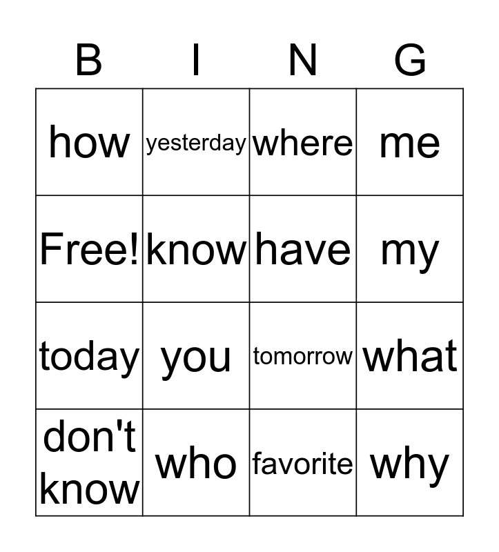 This bingo card has 16 words: who, what, where, how, today, yesterday, tomorrow, favorite, Free!, know, don't know, me, you, my, have and why.