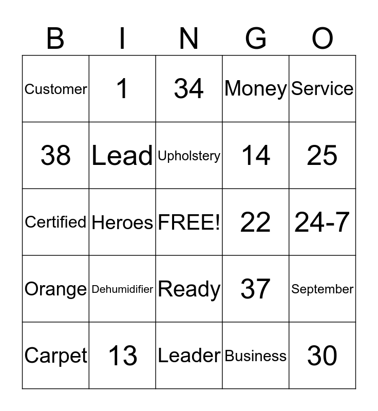 This bingo card has a free space and 97 words: Clean, Servpro, Restoration, Heroes, Stormy, Water, Fire, Mold, Mitigation, Blaze, Premier, Service, Green, Orange, Training, Customer, Service, Satisfaction, 2012, Stafford, Missouri City, Texas, Hot, Professional, Cold, Upholstery, Carpet, September, November, December, Lead, Money, USA, Vision, Leader, Ready, Prepare, Damage, Disaster, Certified, October, 24-7, 365, Business, Dehumidifier, Air Mover, Drying, Management, Duct Cleaning, Dry Cleaning, Smoke, Furniture, Crew Cheif, Best, Great Day, Chemical, EPA, 1, 2, 3, 4, 5, 6, 7, 8, 9, 10, 11, 12, 13, 14, 15, 16, 17, 18, 19, 20, 21, 22, 23, 24, 25, 26, 27, 28, 29, 30, 31, 32, 33, 34, 35, 36, 37, 38, 39 and 40.