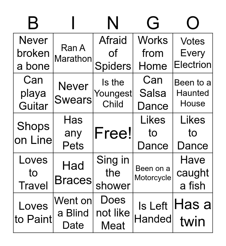 This bingo card has a free space and 24 words: Had Braces, Went on a Blind Date, Is the Youngest Child, Loves to Paint, Votes Every Electrion, Never broken a bone, Can playa Guitar, Ran A Marathon, Likes to Dance, Sing in the shower, Can Salsa Dance, Shops on Line, Been on a Motorcycle, Have caught a fish, Never Swears, Is Left Handed, Likes to Dance, Afraid of Spiders, Been to a Haunted House, Has any Pets, Has a twin, Loves to Travel, Works from Home and Does not like Meat.