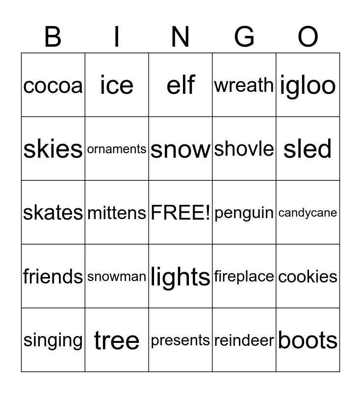 This bingo card has a free space and 24 words: snowman, tree, snow, singing, igloo, cocoa, skies, ice, penguin, lights, shovle, skates, fireplace, cookies, ornaments, reindeer, candycane, elf, sled, mittens, boots, friends, wreath and presents.