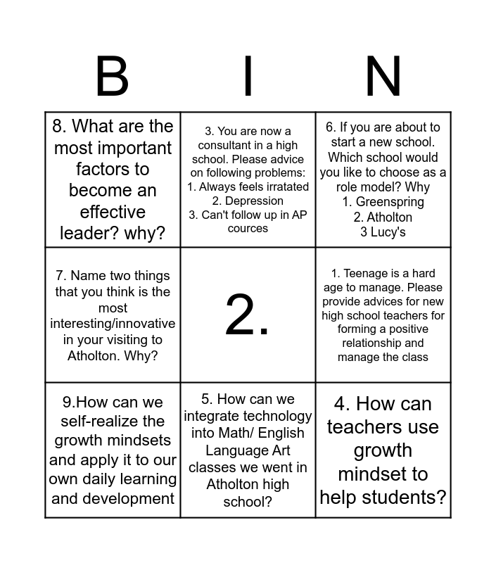 This bingo card has a free space and 8 words: 1. Teenage is a hard age to manage. Please provide advices for new high school teachers for forming a positive relationship and manage the class, 6. If you are about to start a new school. Which school would you like to choose as a role model? Why 1. Greenspring 2. Atholton 3 Lucy's, 3. You are now a consultant in a high school. Please advice on following problems: 1. Always feels irratated 2. Depression 3. Can't follow up in AP cources, 9.How can we self-realize the growth mindsets and apply it to our own daily learning and development, 8. What are the most important factors to become an effective leader? why?, 4. How can teachers use growth mindset to help students?, 7. Name two things that you think is the most interesting/innovative in your visiting to Atholton. Why? and 5. How can we integrate technology into Math/ English Language Art classes we went in Atholton high school?.