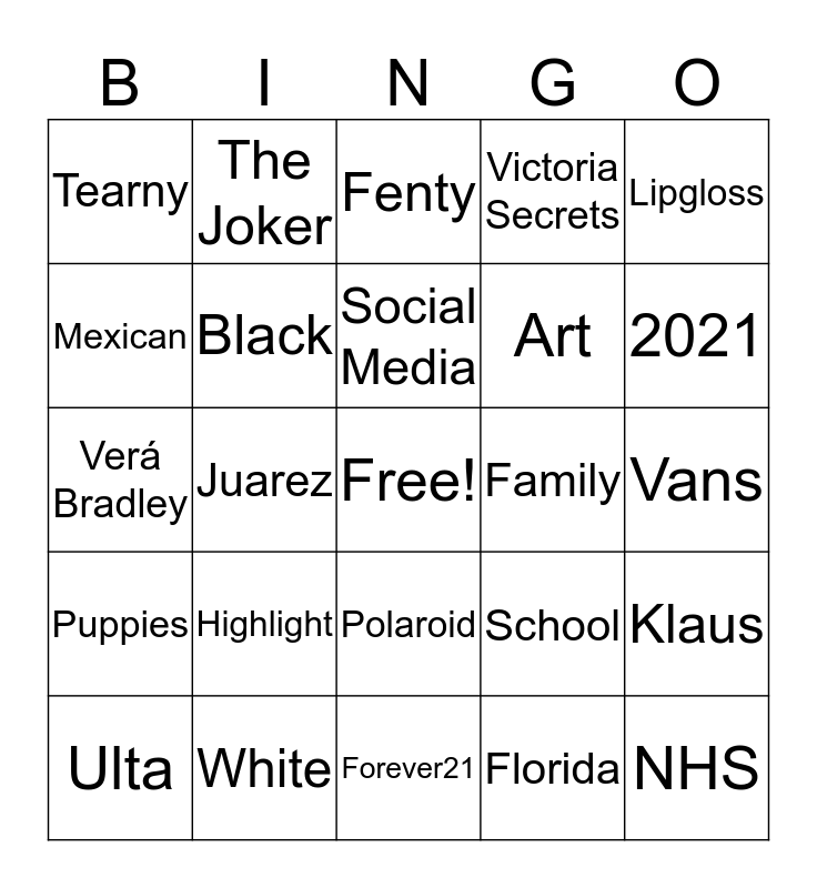 This bingo card has a free space and 29 words: Ulta, Pink, Juarez, 16, Tearny, Fenty, Black, Highlight, Family, White, Vans, NHS, Forever21, Florida, 2021, Friends, Polaroid, Puppies, Lipgloss, Verá Bradley, School, Boys, Art, Mexican, Victoria Secrets, The Joker, Klaus, Social Media and YouTube.
