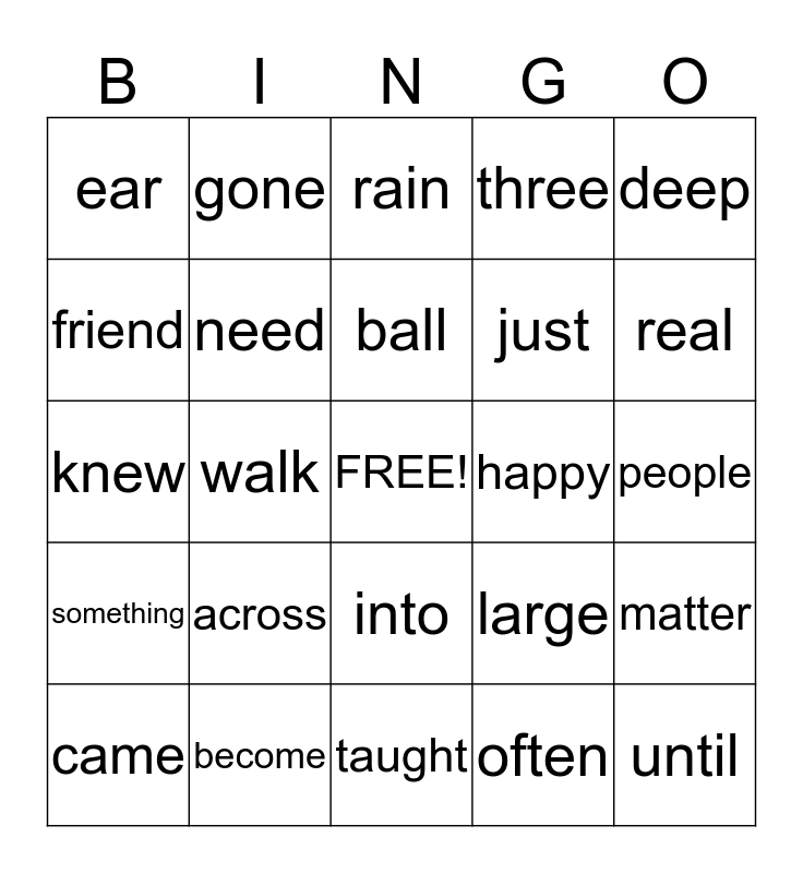 This bingo card has a free space and 24 words: across, become, ball, came, deep, ear, friend, gone, happy, into, just, knew, large, matter, need, often, people, rain, real, walk, until, something, three and taught.