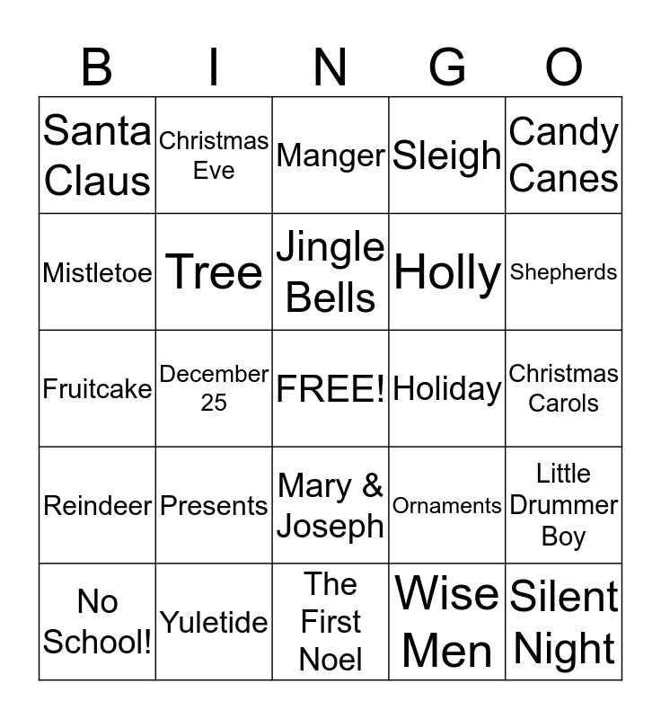 This bingo card has a free space and 29 words: No School!, Christmas, December 25, Baby Jesus, Santa Claus, Manger, Tree, Presents, Holiday, Yuletide, Christmas Carols, Silent Night, The First Noel, Wise Men, Shepherds, Angel, Mary & Joseph, Reindeer, Candy Canes, Fruitcake, Ornaments, Tinsel, Holly, Mistletoe, Sleigh, Christmas Eve, Little Drummer Boy, Jingle Bells and Red & Green.