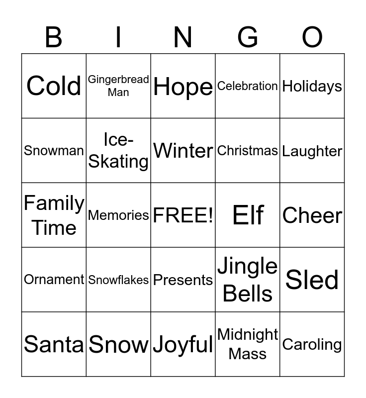 This bingo card has a free space and 24 words: Snowflakes, Snow, Winter, Santa, Holidays, Cold, Snowman, Gingerbread Man, Elf, Presents, Christmas, Family Time, Jingle Bells, Sled, Ice-Skating, Midnight Mass, Cheer, Hope, Laughter, Memories, Caroling, Ornament, Celebration and Joyful.
