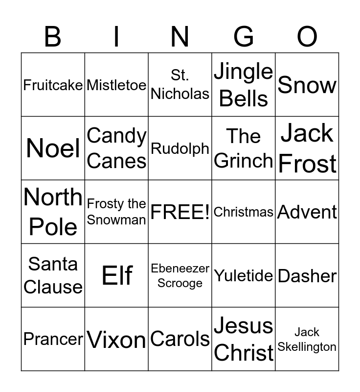 This bingo card has a free space and 24 words: Elf, Vixon, Rudolph, Prancer, Snow, Fruitcake, Noel, Mistletoe, Christmas, Ebeneezer Scrooge, The Grinch, North Pole, Yuletide, Dasher, Candy Canes, Jesus Christ, Advent, St. Nicholas, Jack Frost, Frosty the Snowman, Jack Skellington, Santa Clause, Jingle Bells and Carols.
