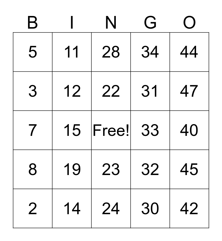 This bingo card has a free space and 49 words: 1, 10, 20, 30, 40, 2, 11, 21, 31, 41, 3, 12, 32, 42, 4, 13, 22, 33, 43, 5, 14, 23, 34, 44, 6, 15, 24, 35, 45, 7, 16, 25, 36, 46, 8, 17, 26, 37, 47, 9, 18, 27, 38, 48, 19, 28, 39, 49 and 29.