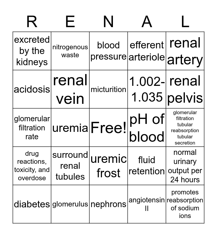 This bingo card has a free space and 24 words: surround renal tubules, glomerulus, micturition, diabetes, renal artery, excreted by the kidneys, acidosis, nitrogenous waste, pH of blood, uremic frost, 1.002-1.035, glomerular filtration rate, fluid retention, normal urinary output per 24 hours, renal vein, angiotensin II, glomerular filtration tubular reabsorption tubular secretion, blood pressure, renal pelvis, uremia, promotes reabsorption of sodium ions, drug reactions, toxicity, and overdose, efferent arteriole and nephrons.