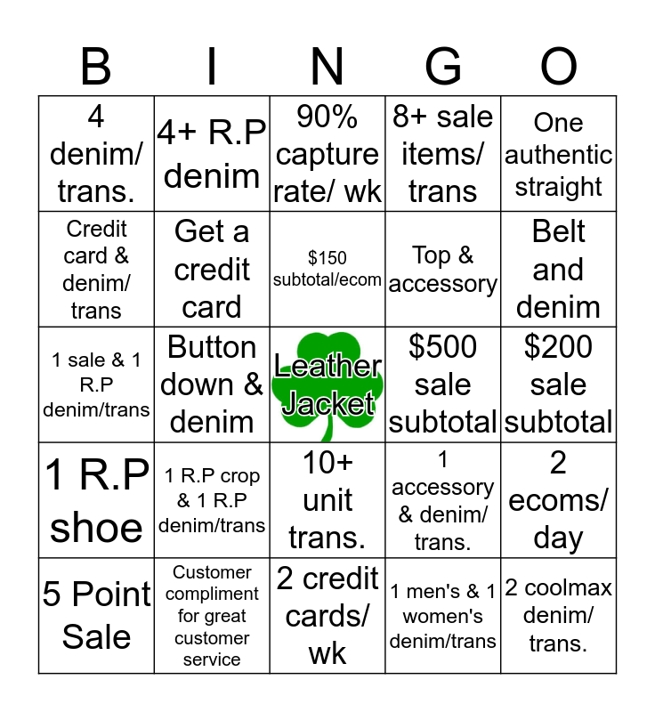 This bingo card has a free space and 29 words: 5 Point Sale, 2.0+ UPT/ wk, Button down & denim, Increase in one KPI from prior wk, 4 denim/ trans., 90% capture rate/ wk, Get a credit card, 1 R.P crop & 1 R.P denim/trans, $500 sale subtotal, Customer compliment for great customer service, $200 sale subtotal, 2 coolmax denim/ trans., 2 credit cards/ wk, 1 men's & 1 women's denim/trans, Belt and denim, 4+ R.P women's tops/trans., 10+ unit trans., 1 R.P shoe, One authentic straight, 1 sale & 1 R.P denim/trans, 1 accessory & denim/ trans., 3 graphics, Top & accessory, Credit card & denim/ trans, 8+ sale items/ trans, 4+ R.P denim, 2 ecoms/ day, $150 subtotal/ecom and 1 R.P jacket.