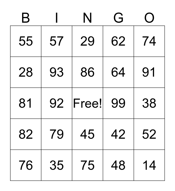 This bingo card has a free space and 29 words: 76, 28, 92, 67, 55, 29, 93, 79, 99, 35, 38, 14, 75, 48, 91, 37, 45, 82, 74, 81, 42, 73, 64, 28, 62, 57, 52, 86 and 93.