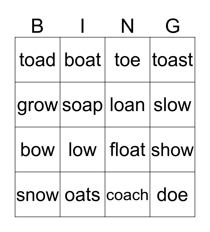 This bingo card has 16 words: oats, show, toe, toad, bow, boat, float, coach, grow, soap, snow, toast, low, slow, loan and doe.