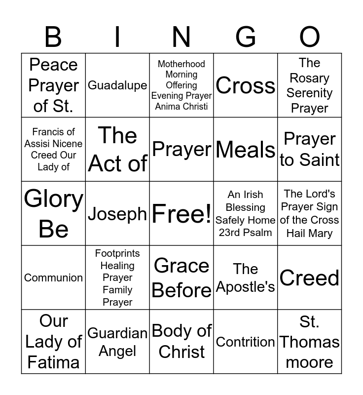 This bingo card has a free space and 24 words: Footprints Healing Prayer Family Prayer, Guardian Angel, Prayer, Our Lady of Fatima, The Rosary Serenity Prayer, Peace Prayer of St., Francis of Assisi Nicene Creed Our Lady of, Guadalupe, An Irish Blessing Safely Home 23rd Psalm, Grace Before, Meals, Glory Be, The Apostle's, Creed, The Act of, Contrition, The Lord's Prayer Sign of the Cross Hail Mary, Motherhood Morning Offering Evening Prayer Anima Christi, Prayer to Saint, Joseph, St. Thomas moore, Communion, Cross and Body of Christ.