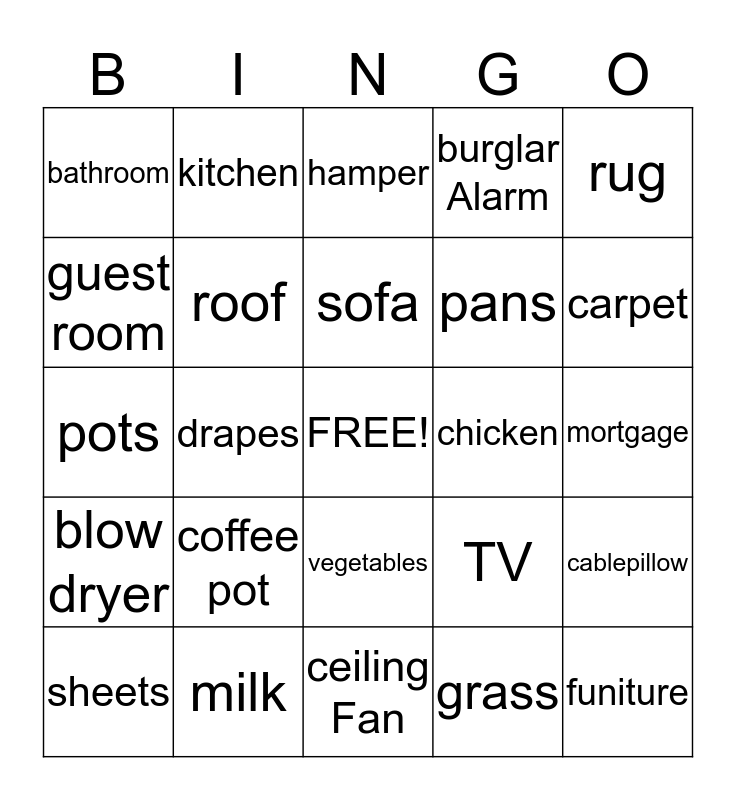 This bingo card has a free space and 24 words: coffee pot, milk, sofa, sheets, rug, bathroom, guest room, kitchen, chicken, vegetables, pans, pots, TV, cablepillow, roof, grass, mortgage, hamper, carpet, drapes, funiture, blow dryer, burglar Alarm and ceiling Fan.