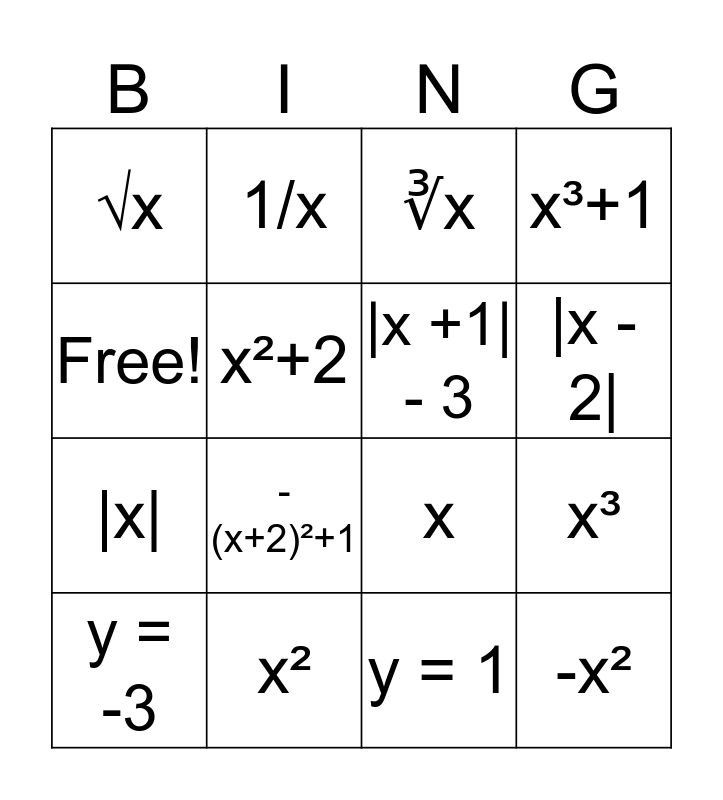 This bingo card has 16 words: x², x³, ∛x, √x, |x|, 1/x, x, y = 1, Free!, x²+2, y = -3, x³+1, -(x+2)²+1, |x - 2|, |x +1| - 3 and -x².